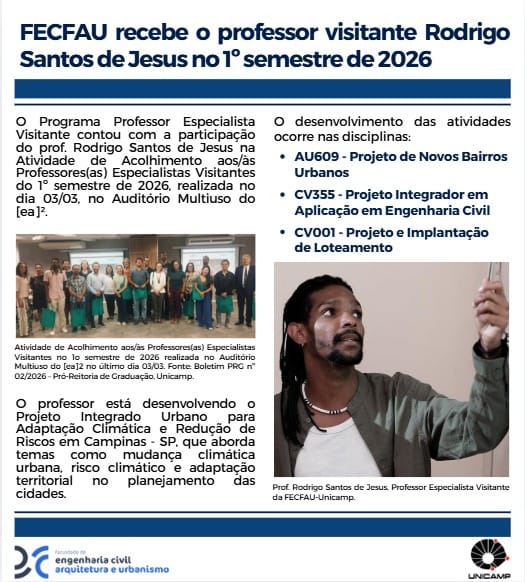 A Faculdade de Engenharia Civil, Arquitetura e Urbanismo da Unicamp recebeu, no primeiro semestre de 2026, o professor visitante Rodrigo Santos de Jesus por meio do Programa Professor Especialista Visitante.